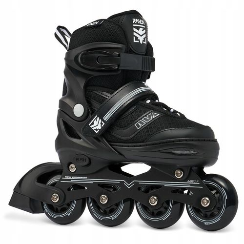 Te rolki RAVEN Drill Black wyposażone są w rewolucyjny system regulacji rozmiaru 34-37 (21,5-24cm) z wbudowaną sprężyną, który nie wymaga żadnych narzędzi. Przycisk regulacyjny zapewnia błyskawiczną, bezpieczną zmianę rozmiaru, gwarantując jednocześnie pełną stabilność podczas jazdy po każdym terenie. Dzięki temu rozwiązaniu rolki służą przez wiele sezonów, zawsze idealnie dopasowane do stopy.