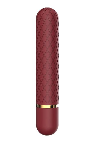 Kieszonkowy wibrator w kształcie pocisku Lizzy w kolorze bordowej czerwieni ma strukturę w kształcie rombu z miękkiego silikonu spożywczego o sztywnej konstrukcji