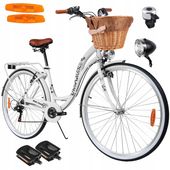 Ten miejski rower damski został wyposażony w szereg przydatnych akcesoriów, ułatwiających codzienne użytkowanie. Pojemny wiklinowy koszyk, bagażnik, błotniki, dzwonek i oświetlenie czynią go doskonałym środkiem transportu na zakupy, do pracy czy na weekendowe przejażdżki.