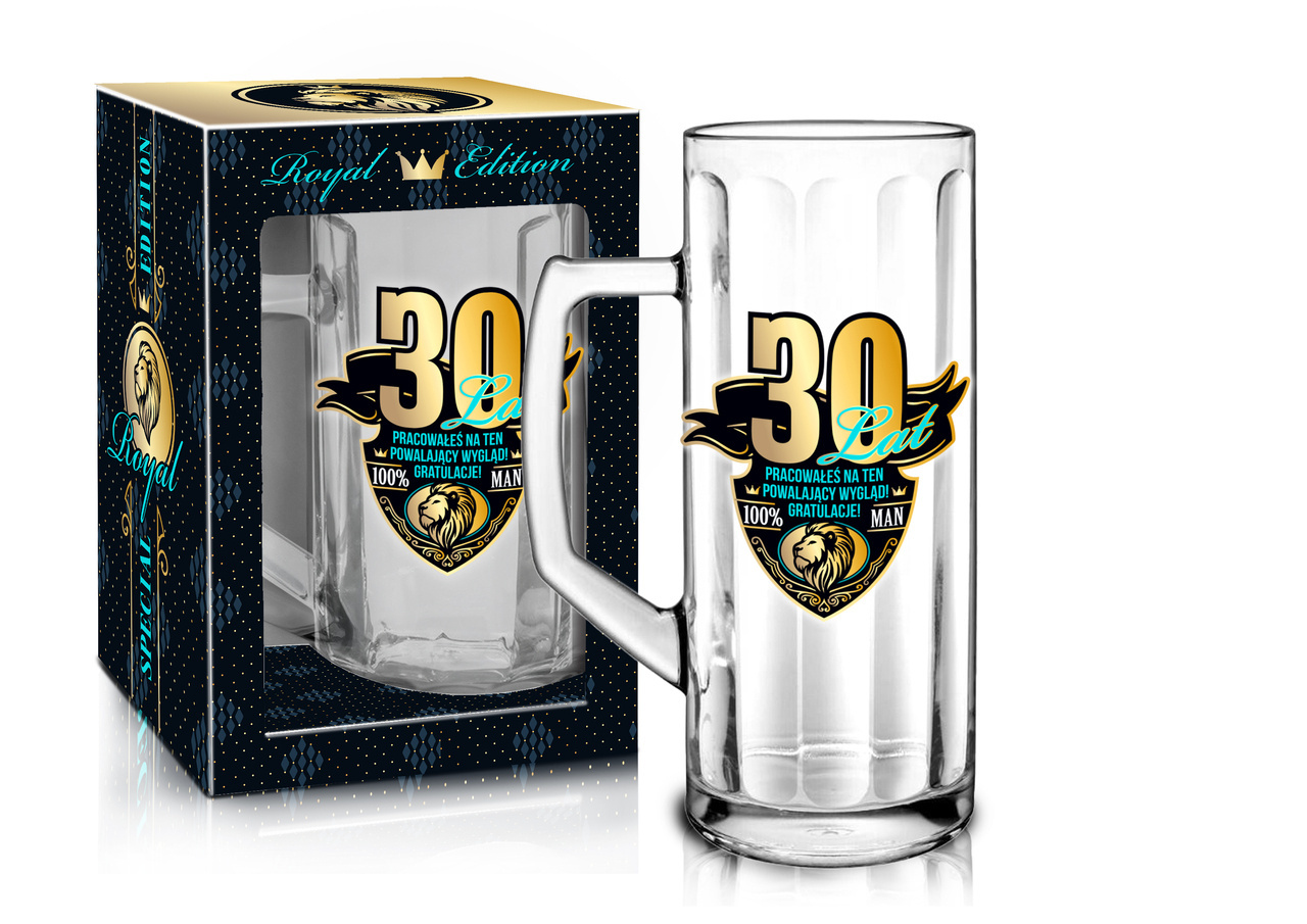 Kufel z napisem "30 Lat pracowałeś na ten powalający wygląd! Gratulacje! 100% Man".