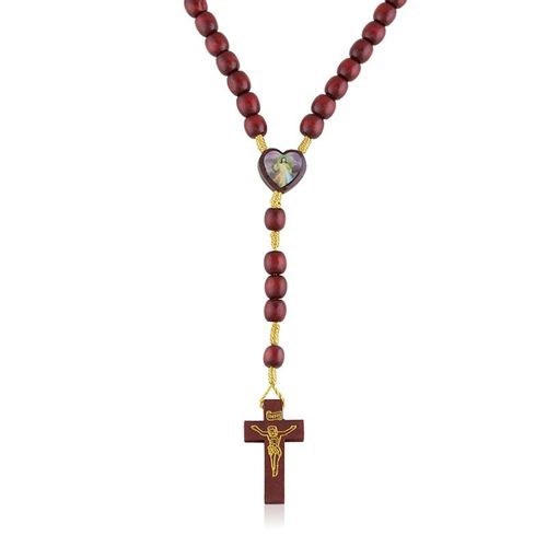 Klasyczny różaniec wykonany z drewnianych paciorków w kolorze bordowym połączonych sznurkiem, zakończony krzyżykiem. Różaniec może być wyjątkowym prezentem z okazji uroczystości religijnych.