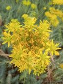 Rozchodnik ościsty - Sedum reflexum (pojemnik P7) jest rośliną kobiercową, która najpiękniej prezentuje się w dużym skupisku. Warto zostawić jej trochę miejsca, aby nie stała się mało widocznym elementem skalnika. Pięknie zaprezentuje się na skalniku, skalistych zakątkach ogrodu, pojemnikach, a także na rabacie. Osiąga wysokość do około 15 cm, charakteryzując się ulistnionymi pędami, zimozielonymi, wałeczkowatymi liśćmi. Pędy u dołu lekko zdrewniałe, kwiatostan w formie baldachy, złożony z licznych kwiatów w słonecznej barwie, które rozjaśnią skalniak w okresie letnim.