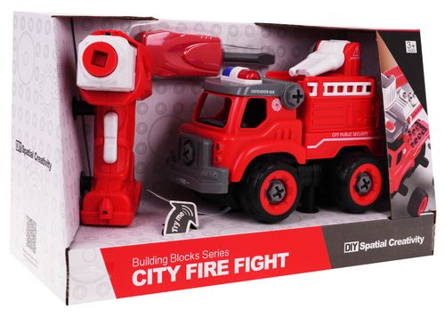 | Interaktywny pojazd Straży Pożarnej do skręcania dla dzieci od 3-go roku życia z akcesoriami w zestawie. Pojazd otrzymujemy skręcony i kompletny, możemy go rozłożyć na części pierwsze za pomocą dołączonego do zestawu śrubokręta lub wkrętarko wiertarki. Śrubokręt jest manualny, natomiast wkrętarko wiertarka jest na baterie, zasilana bateriami typu 2 x AA 1,5 V (brak w zestawie). Wiertarka posiada wyjmowany panel, jeżeli przełożymy ten panel do pojazdu, możemy go sterować do przodu i do tyłu. Panel posiada również możliwość ustawienia, by pojazd jeździł sam do przodu albo do tyłu. Wóz strażacki ponadto posiada efekty dźwiękowe w postaci alarmów strażackich oraz ruchome elementy takie jak wysięgnik czy dach pojazdu. Zabawka wykonana została z najlepszej jakości materiałów, w żywych kolorach. Panel sterujący zasilany jest bateriami typu 2 x AA 1,5 V (brak w zestawie), autko bateriami typu 3 x AG13 (w zestawie).