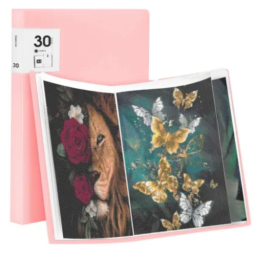Doskonałej jakości różowy album A3 do haftu diamentowego nie tylko służy do eleganckiego przechowywania prac, ale także ułatwia ich organizację. Z przezroczystymi kieszeniami, które nie tylko ochronią Twoje prace, ale także ułatwią Ci szybki dostęp do ulubionych wzorów.