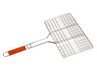 Ruszt do grillowania ryb 34 x 22cm. Ruszt skonstruowany został w sposób umożliwiający łatwe pieczenie soczystych i pysznych ryb. Dzięki temu, że potrawy można zamknąć między siatkami rusztu, nie rozpadają się one w trakcie pieczenia i obracania. Dla łatwiejszej obsługi i wygody, ruszt został wyposażony w drewniany uchwyt. Nic nie stoi na przeszkodzie aby zastosować go także do smażenia zwykłego mięsa.
