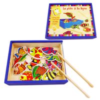 W zestawie znajduje się 12 rybek i dwie wędki, wszystko zapakowane w ładne pudełko wykonane z drewna.