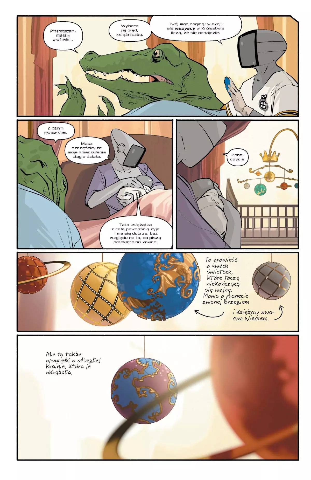 Album zawiera materiał opublikowany pierwotnie na łamach Saga #19–24 Laureaci nagrody Hugo – Brian K. Vaughan (The Private Eye; Lwy z Bagdadu) i Fiona Staples (Mystery Society, Archie) stworzyli Sagę – porywającą opowieść o młodej rodzinie, walczącej o swoje miejsce we wszechświecie. Bohaterowie odwiedzają nowy, dziwny świat i napotykają nowych przeciwników, mała Hazel zaczyna chodzić, a jej prześladowani przez los rodzice, Marko i Alana, z trudem sami utrzymują się na nogach.