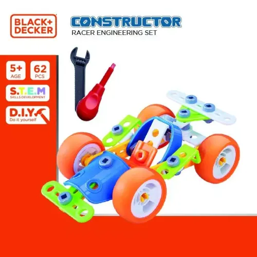 Szczypta kreatywności, odrobina cierpliwości i 62 plastikowe, różnokolorowe elementy oto przepis na stworzenie własnego projektu DIY w postaci samochodu wyścigowego. Zabawka od Black + Decker przeznaczona jest dla dzieci od 5 roku życia. W zestawie znajdują się części, wśród których dominuje kolor niebieski, pomarańczowy oraz zielony. Połączenie ich śrubami przynosi dziecku satysfakcjonujące rezultaty, dzięki którym zabawka cieszy zdecydowanie dłużej. Z pewnością będzie z niej zadowolony każdy mały fan Formuły 1. Co więcej, do zestawu dołączono instrukcję obsługi, która ułatwi proces montażu.