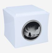 Urna ma klasyczny kształt pudełka, dostępny w eleganckim czarnym lub białym kolorze, z delikatnie zaokrąglonymi krawędziami. Na froncie znajduje się grawerowana grafika postaci siedzącej samotnie na ławce – subtelne, ale wymowne przedstawienie refleksji i smutku po stracie ukochanej osoby.