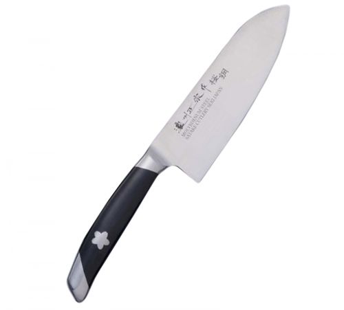 Przedstawiamy tradycyjny japoński nóż z serii Sakura, przeznaczony do krojenia warzyw i owoców. Szeroka klinga ułatwia przenoszenie pokrojonych produktów. Wysoka rękojeść zapobiega uderzanie o deskę. Nóż Santoku dzięki swoim gabarytom doskonale sprawdza się w krojeniu dużych produktów takich jak arbuz, kapusta.