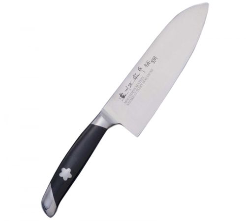 Przedstawiamy tradycyjny japoński nóż z serii Sakura, przeznaczony do krojenia warzyw i owoców. Szeroka klinga ułatwia przenoszenie pokrojonych produktów. Wysoka rękojeść zapobiega uderzanie o deskę. Nóż Santoku dzięki swoim gabarytom doskonale sprawdza się w krojeniu dużych produktów takich jak arbuz, kapusta.