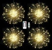 Ściemniane 4 światła Starburst w motywie fajerwerków. Towar powystawowy, outletowy, stoki magazynowe, sporadycznie używanych. Urządzenia mogą posiadać opakowania zastępcze lub oryginalne. Przedstawione zdjęcia są poglądowe. Ściemniane światła Starburst w motywie fajerwerków, 4 sztuki x 120 diod LED, zasilane przez USB 8 trybów. Oświetlenie z drutu miedzianego ze zdalnym sterowaniem, wodoodporne, wiszące (ciepła biel). ?Wysoka elastyczność i ulepszenie 4 x 120 LED Światło fajerwerków składa się z 480 ulepszonych diod LED i 240 pasm bardzo elastycznych drutów miedzianych, które można łatwo wygiąć w dowolny kształt, taki jak kwiaty, fajerwerki, serce. Udekoruj każdą uroczystość tymi bajkowymi lampkami, które stworzą świąteczną i romantyczną atmosferę! ?Zasilanie przez USB i zdalne sterowanie Światła Starburst są zaprojektowane z zasilaniem USB 5 V, bez baterii, możesz je zabrać w dowolne miejsce za pomocą zasilacza mobilnego. Dekoracyjne światła z pilotem obsługują efektywny zasięg odbioru do 10-15 metrów, aby kontrolować 8 różnych trybów migania (stały / błyskowy itp.). ?Funkcja timera i wodoodporność IP67 Aby uniknąć zapomnienia o wyłączeniu bajkowych lampek, możesz ustawić czas, naciskając przycisk TIMER, lampki będą włączone przez 6 godzin i wyłączone przez 18 godzin dziennie, nie musisz się martwić o marnowaniu energii. Latarka Starburst i pojemnik na baterie są wodoodporne o stopniu ochrony IP67, dzięki czemu idealnie nadają się do użytku nawet w deszczowe lub śnieżne dni. ?Szeroki i bezpieczny w użyciu Lampa wisząca jest bardzo jasna i nadaje się do dekoracji altany, ozdób choinkowych, ogrodu, wesela, imprezy, namiotu itp. Światła fajerwerków mniszka lekarskiego z żarówkami LED o niskiej emisji ciepła nie przegrzewają się po Długi czas użytkowania, ochrona środowiska i bezpieczeństwo użytkowania. Wymiary: długość drutów miedzianych z diodami 20 cm, długość całkowita przewodu 2,89 m, odstęp między zestawami diod 1 m, długość przewodu łączącego zestaw światełek z głównym przewodem 30 cm. Ściemniane światła Starburst w motywie fajerwerków, 4 sztuki x 120 diod LED, zasilane przez USB 8 tr