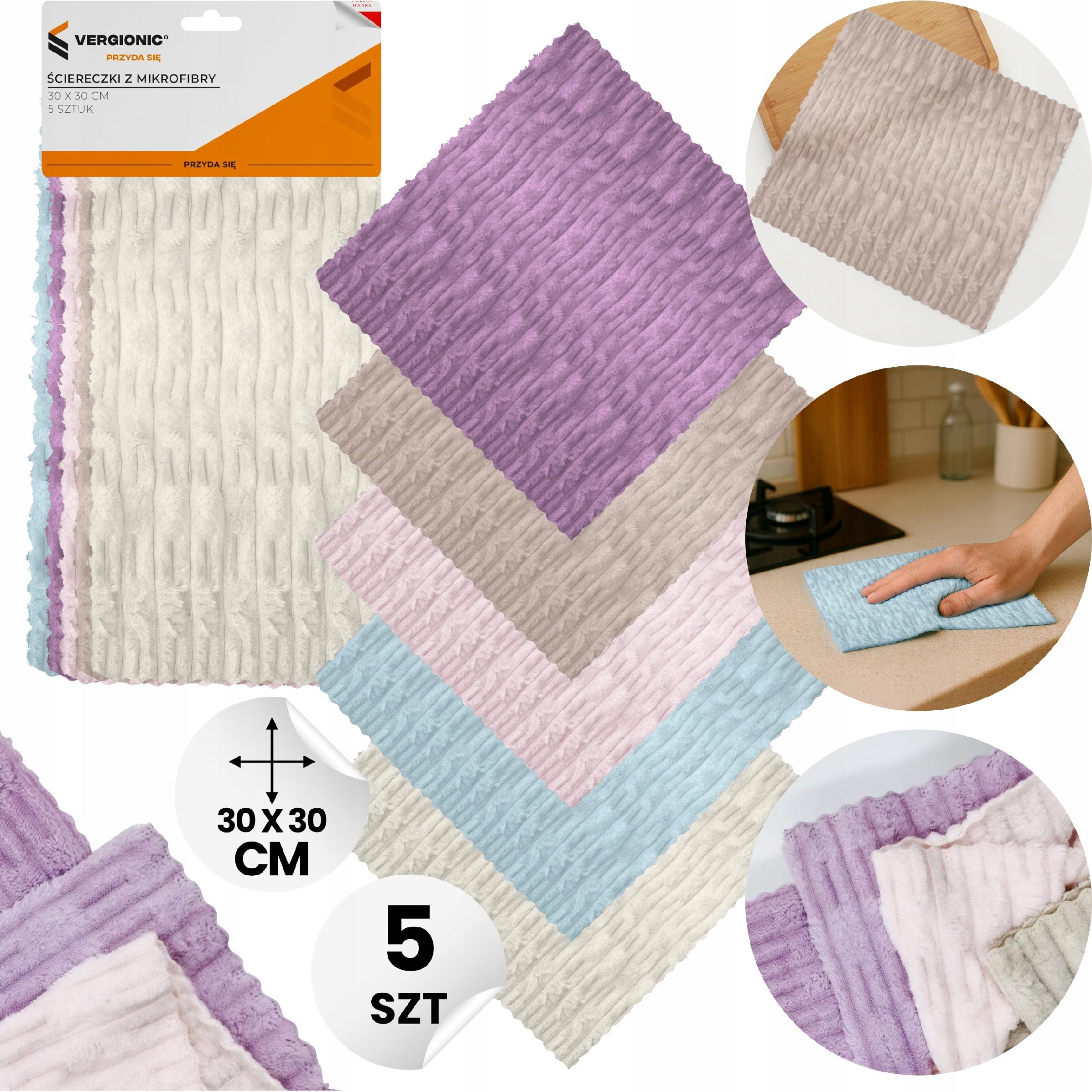 Zestaw 5 miękkich ściereczek z mikrofibry VERGIONIC o wymiarach 30 × 30 cm to niezastąpione akcesoria do codziennego sprzątania w domu, biurze czy aucie. Dzięki wysokiej chłonności i zdolności do przyciągania kurzu oraz brudu, szmatki sprawdzają się doskonale przy czyszczeniu mebli, blatów, luster, okien, ekranów czy karoserii.