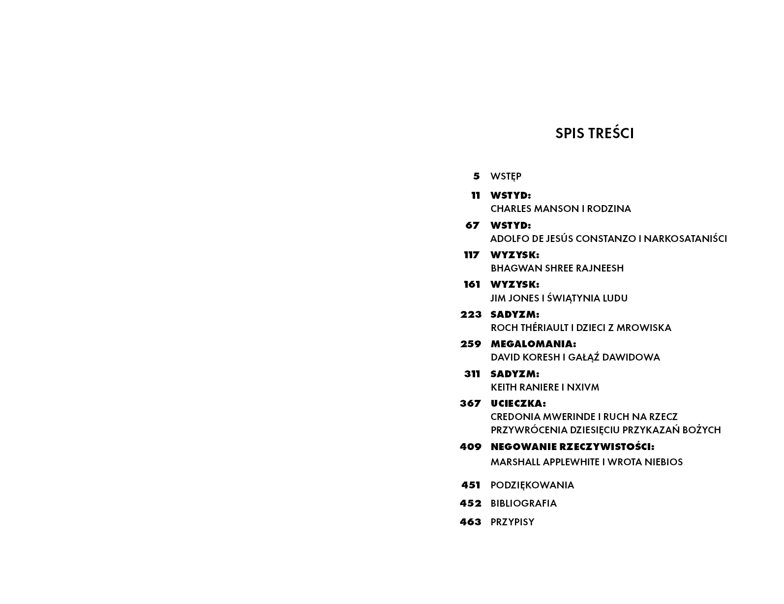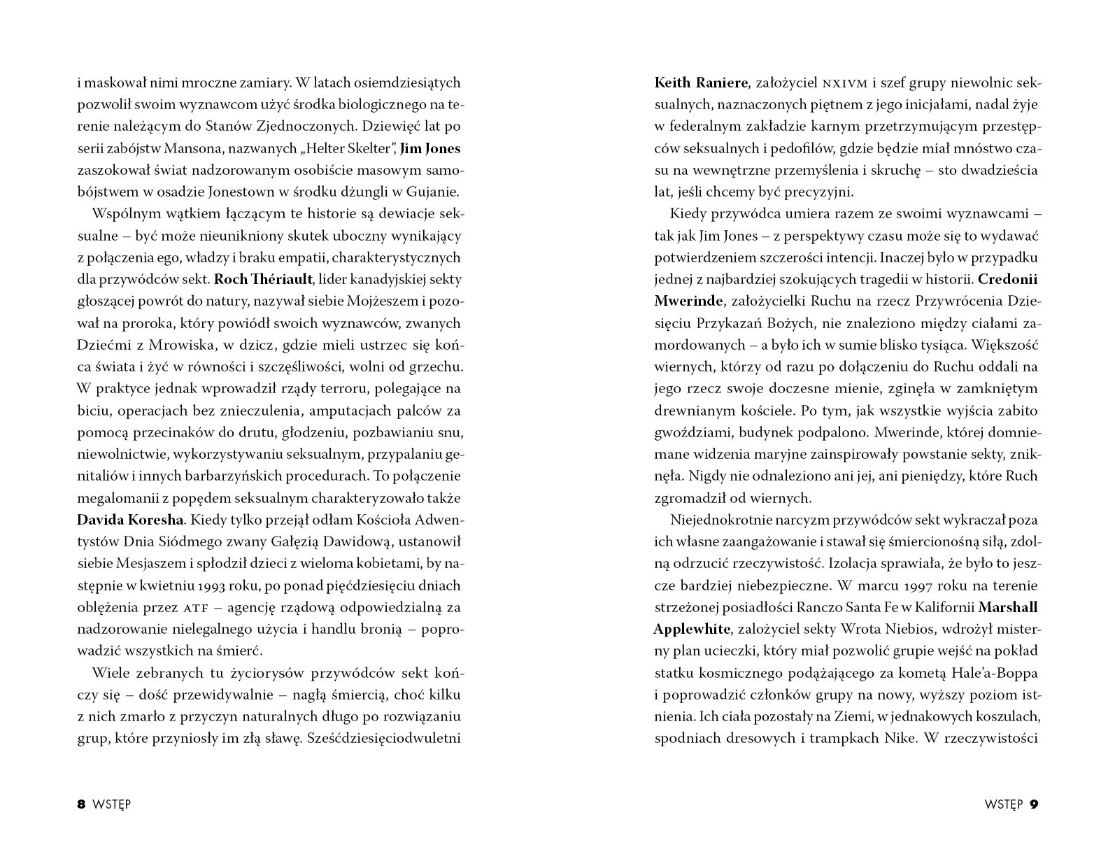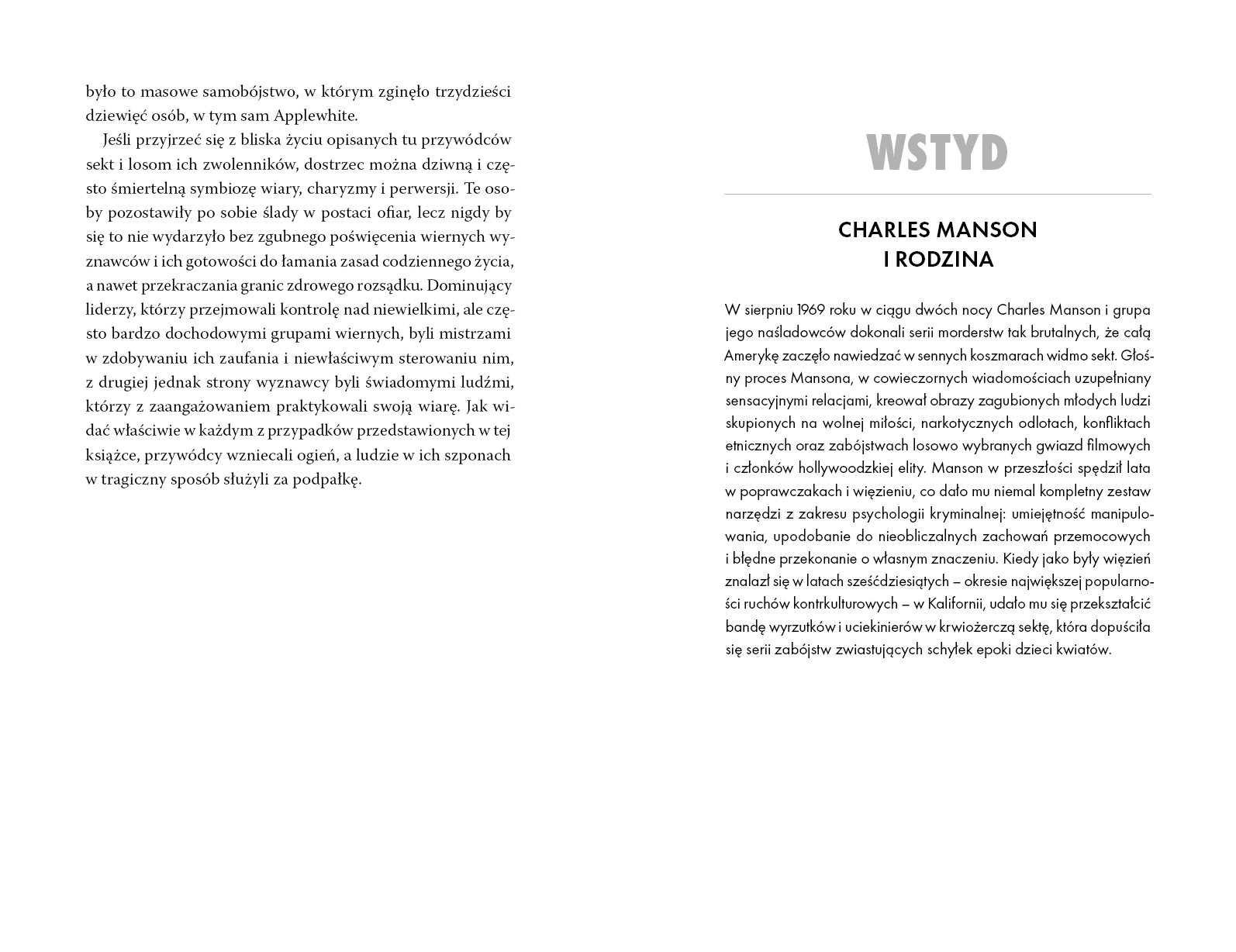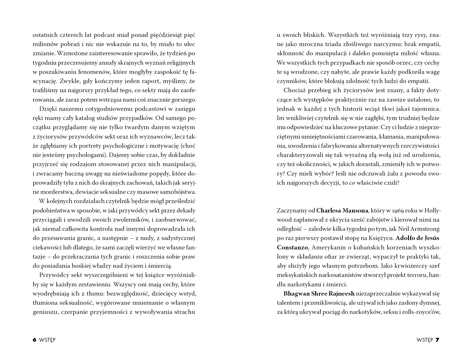 Tajemnice, morderstwa, terror. Cała prawda o sektach i technikach manipulacji stosowanych przez ich przywódców. Kim był przywódca sekty narkosatanistów, która owijała drutem ciała swoich ofiar, aby potem móc z ich kręgosłupów robić magiczne naszyjniki? Jak Keith Raniere sprawił, że uczestniczki warsztatów samorozwoju zamieniły się w grupę seksualnych niewolnic, którym wypalano na ciele jego inicjały? W jaki sposób Jim Jones doprowadził ponad 900 swoich wyznawców do największego masowego samobójstwa? Co tak naprawdę dzieje się wewnątrz sekt? Co sprawia, że ich przywódcy są w stanie uwodzić tłumy? Dlaczego tak wiele osób fanatycznie wyznaje absurdalne i groźne idee? Dzięki sprzedaży błogosławieństw Bhagwan Shree Rajneesh mógł sobie bez problemu pozwolić na zakup 93 rolls-royce'ów. Charles Manson potrafił tak zmanipulować członków swojej Rodziny, że w jego imieniu dokonywali makabrycznych zbrodni - w tym zabójstwa ciężarnej Sharon Tate. Przed wami historia dziewięciu sekt stworzonych przez ludzi, których psychopatyczne skłonności sprawiały, że bezlitośnie wykorzystywali każdą słabość ludzkiej natury. Sekty to jedyna taka książka – przeraża i fascynuje.