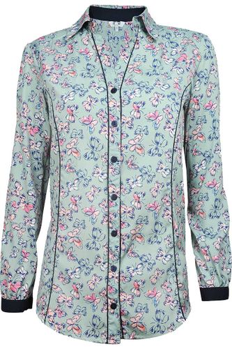 Koszula firmy Debenhams. Koszula w odcieniu seledynowym w wielokolorowe motyle. Na długi rękaw. Z przodu zapinana na guziki. Koszula taliowana, wyprofilowana, dobrze dopasowuje się do sylwetki. Z kołnierzykiem. Dekolt w kształcie litery "V". Zakończenia rękawów zapinane na guzik.