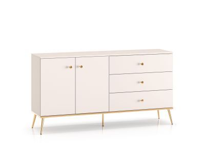Duża komoda Selgin 03 to idealny mebel do przechowywania. Za obojgiem drzwi znajdują się półka dzieląca przestrzeń na dwie pojemne wnęki. Przechowasz w nich ubrania, ręczniki czy pościel. Środek mebla tworzą cztery głębokie szuflady, które zapewnią odpowiednią ilość miejsca na dokumenty, obrusy lub inne domowe tekstylia. Komoda będzie świetnym dopełnieniem Twojego salonu lub sypialni. Szeroki blat będzie idealnym miejscem do wyeksponowania eleganckich wazonów, pamiątek z podróży lub innych ulubionych gadżetów. Bryła mebla posadowiona jest na stabilnych, wysokich nóżkach wykonanych z wytrzymałego metalu. Podwójnie galwanizowane uchwyty oraz nogi w złotym wybarwieniu gwarantują wieloletnie, wygodne użytkowanie. Meble z kolekcji Selgin łączą w sobie wysoką funkcjonalność z zachwycającym designem.
