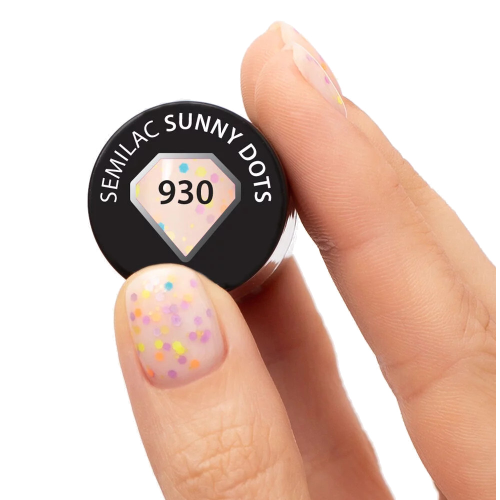 Postaw na Semilac 930 Sunny Dots i ciesz się unikalnym połączeniem klasycznego beżu z nowoczesnym, wielokolorowym efektem, który doda Twoim paznokciom charakteru i świeżości.