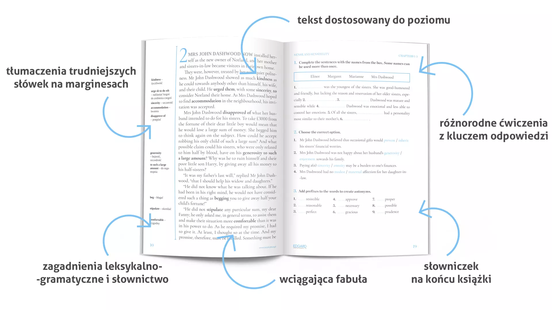 - sprawdzaj znaczenie słówek, nie odrywając się od lektury dzięki tłumaczeniom na marginesach,