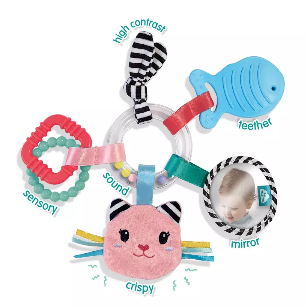Z szeleszczącym kotem z wąsami i lusterkiem lub gryzakiem z wypukłościami to koło do zabawy pobudzi wszystkie zmysły!