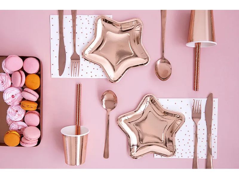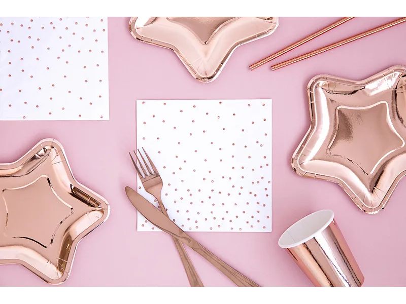 Nie czekaj i już dziś zamów serwetki "Kropki" w białym kolorze z różowo-złotym nadrukiem. Spraw, aby Twoje spotkanie na długo pozostało w pamięci Twoich gości!
