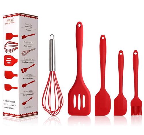 Silikonowe Przybory Kuchenne 5 szt Czerwone. Towar powystawowy, outletowy, stoki magazynowe. Urządzenia mogą posiadać opakowania zastępcze lub oryginalne. . Zestaw Silikonowych Przyborów Kuchennych Kolor Czerwony. Zestaw przyborów kuchennych wykonany z silikonu spożywczego, bez BPA i zatwierdzony przez FDA. Silikonowe głowice wytrzymują temperatury od -40°C do 230°C. Wysokiej jakości silikonowe przybory o ergonomicznej, bezszwowej, jednoczęściowej konstrukcji, trwałe oraz nie deformujące się zapewniają wygodny chwyt oraz nie niszczą garnków. Zestaw przyborów kuchennych zawiera silikonową szpatułkę, łyżkę cedzakową, trzepaczkę, pędzel do ciasta. Może być używany podczas robienia ciast, grillowania, smażonego steku i pysznego jedzenia. Dane techniczne: Producent: ?DHBJT Materiał: Sylikon Mała silikonowe szpatułka: 21.59 cm x 4 cm, 44 g. Duża silikonowa szpatułka: 25,5 cm x 5,2 cm, 90 g Pędzel do olejowania: 20,8 cm x 3,4 cm, 42 g Łopatka cedzakowa: 29,6 cm x 8,3 cm, 109 g Kolor: Czerwony. Zestaw Silikonowych Przyborów Kuchennych Kolor Czerwony
