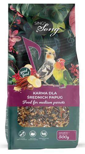 Skład: proso 25%, owies bezłuskowy 15%, pszenica 10%, Słonecznik biały 8%, słonecznik pasiak 8%, słonecznik czarny 8%, susz jabłka 5%, nasina mozgi kanaryjskiej 5%, proso czerwone 5%, gryka 4%, kardi 3%, ryż paddy 2%, orzechy 2%, suszone banany 1%, susz marchewki 1%, susz porzeczki 1%, siemię lniane 1%, konopie 1%, murzynek 1%, kwiaty rumianku 0,5%