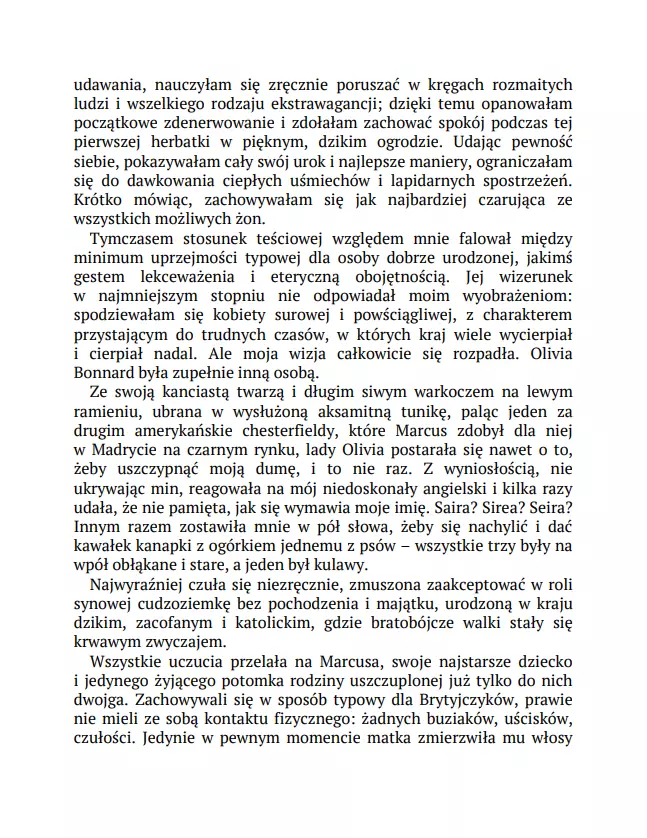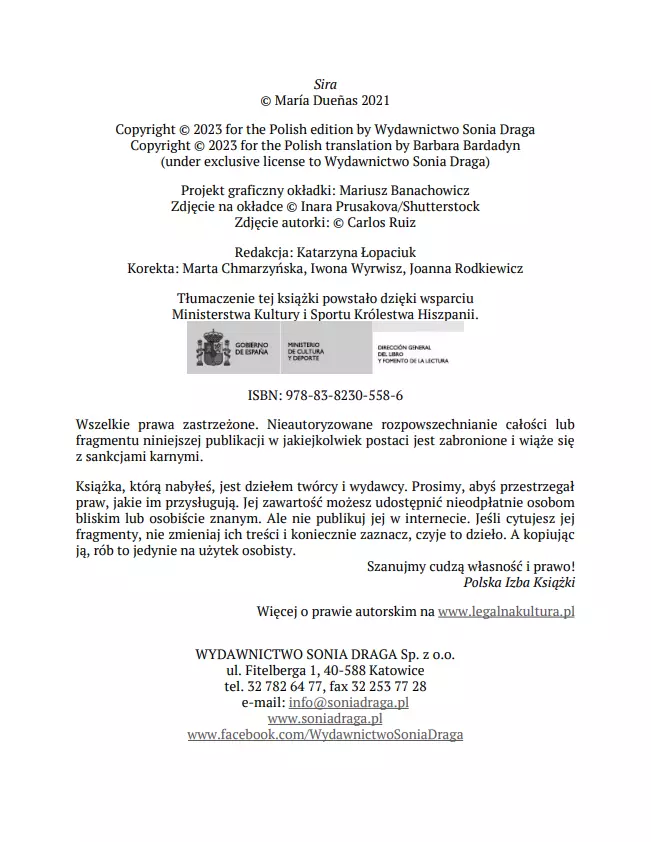 Kontynuacja losów Siry, bohaterki bestsellerowej Krawcowej z Madrytu Sira Bonnard (wcześniej Arish Agoriuq, wcześniej Sira Quiroga) nie jest już niewinną krawcową, która oczarowała czytelników pośród wykrojów i szpiegowskich intryg, ale jej urok pozostał niezmienny. Wraca Sira, charyzmatyczna i niezapomniana. Wraca Krawcowa z Madrytu. Cztery miejsca. Dwie misje. Jedna kobieta. Zanurz się znowu w niezapomnianej epoce. Sira, nowa powieść Maríi Dueñas, autorki Krawcowej z Madrytu. Druga wojna światowa dobiega końca i świat rozpoczyna trudną odbudowę. Po wypełnieniu swoich zadań jako współpracowniczka brytyjskiego wywiadu, Sira spogląda w przyszłość, pragnąc spokoju. Nie zdoła go jednak znaleźć. Los przygotował dla niej bowiem tragiczne doświadczenie, które zmusi ją do odkrycia siebie na nowo, przejęcia kontroli nad własnym życiem i zaciekłej walki o swoją przyszłość. Sira znajdzie się w Jerozolimie, Londynie, Madrycie i Tangerze, w samym środku historycznych wydarzeń, które naznaczą całą epokę. Będzie musiała stawić czoło rozterkom i ponownym spotkaniom, ryzykownym zadaniom i macierzyństwu.