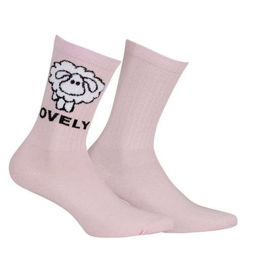 Skarpetki dziewczęce Lovely ● młodzieżowe skarpety dla dziewczynek ● wykonane z przyjemnej dla ciała bawełny ● z ozdobnym, marszczonym ściągaczem ● zapewniają komfort podczas noszenia ● sciągacz ozdobiony uroczą owieczką z napisem "LOVELY" ● z płaskim, wygodnym szwem