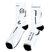 Białe tło stanowi doskonałe płótno dla czarnych, minimalistycznych grafik. Surowe linie i subtelne napisy nadają skarpetom niepowtarzalnego charakteru: