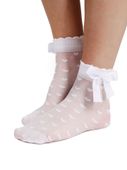Skarpety w wydaniu eleganckim i z klasą. W klasycznym kolorze białym ze wzorem w małe serduszka. Kokardka na górze skarpet dodaje zabawnego, dziewczęcego akcentu.