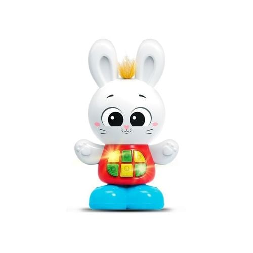 Wesoły, rozgadany króliczek wie jak zainteresować najmłodszych! Zna aż 25 różnych dźwięków i melodii, w tym nawet edukacyjną piosenkę. Poszczególne funkcje aktywują świecące przyciski, znajdujące się na króliczym brzuchu. Głowę zwierzaka zdobi żółta czuprynka z sensorem dotyku. Gdy dotkniemy jej, aktywujemy zabawne dźwięki. Króliczek posiada sprężyste nóżki, co umożliwia przyciśnięcie go, której to czynności towarzyszy odgłos sprężynowych podskoków.