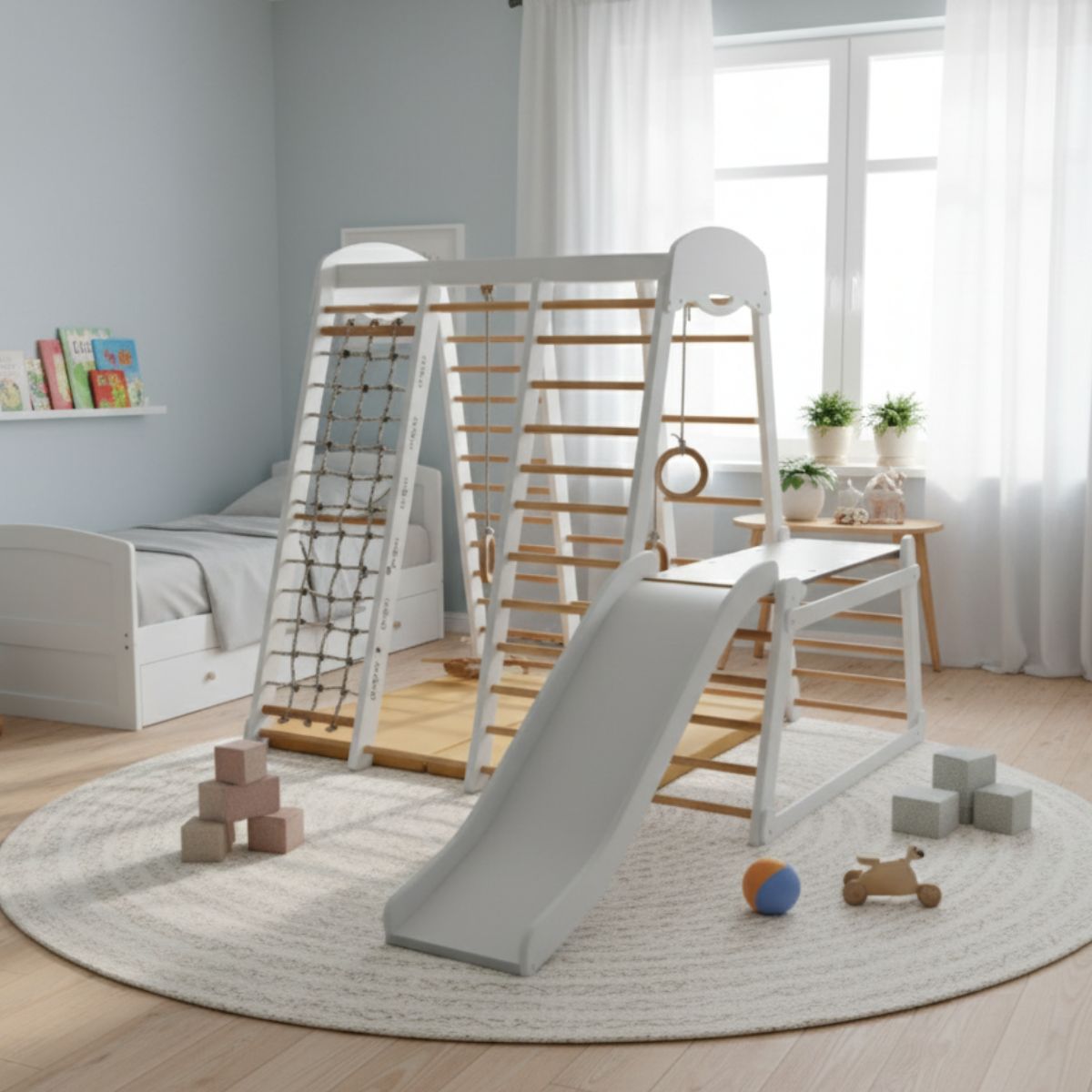 Zjeżdżalnia Mamut to solidna i estetyczna zjeżdżalnia dziecięca, zaprojektowana z myślą o bezpiecznej zabawie w domu lub w przestrzeniach przeznaczonych dla dzieci. Minimalistyczne wzornictwo oraz naturalne materiały sprawiają, że doskonale pasuje do nowoczesnych i klasycznych wnętrz.