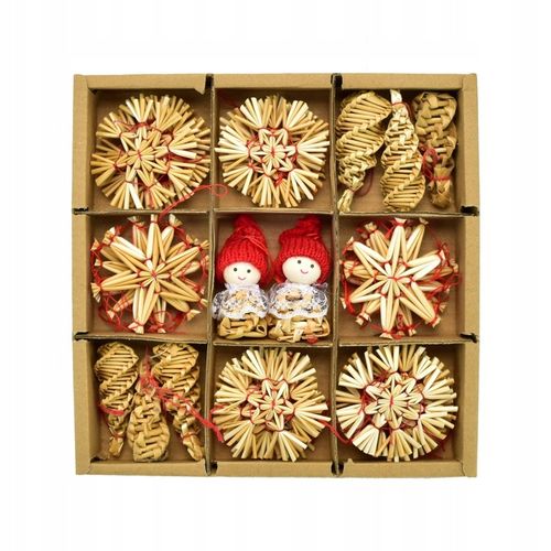 Te wysokiej jakości słomiane ozdoby świąteczne Dommio model z 38 elementami wyróżniają się autentycznym, ręcznie wykonanym wykończeniem, które oddaje tradycyjny urok Bożego Narodzenia. Naturalny kolor słomy z precyzyjnymi czerwonymi przeszyciami zapewnia nie tylko wizualną harmonię, ale także trwałość, która przetrwa wiele sezonów dekoracji, tworząc ciepłą i autentyczną atmosferę w każdym wnętrzu.