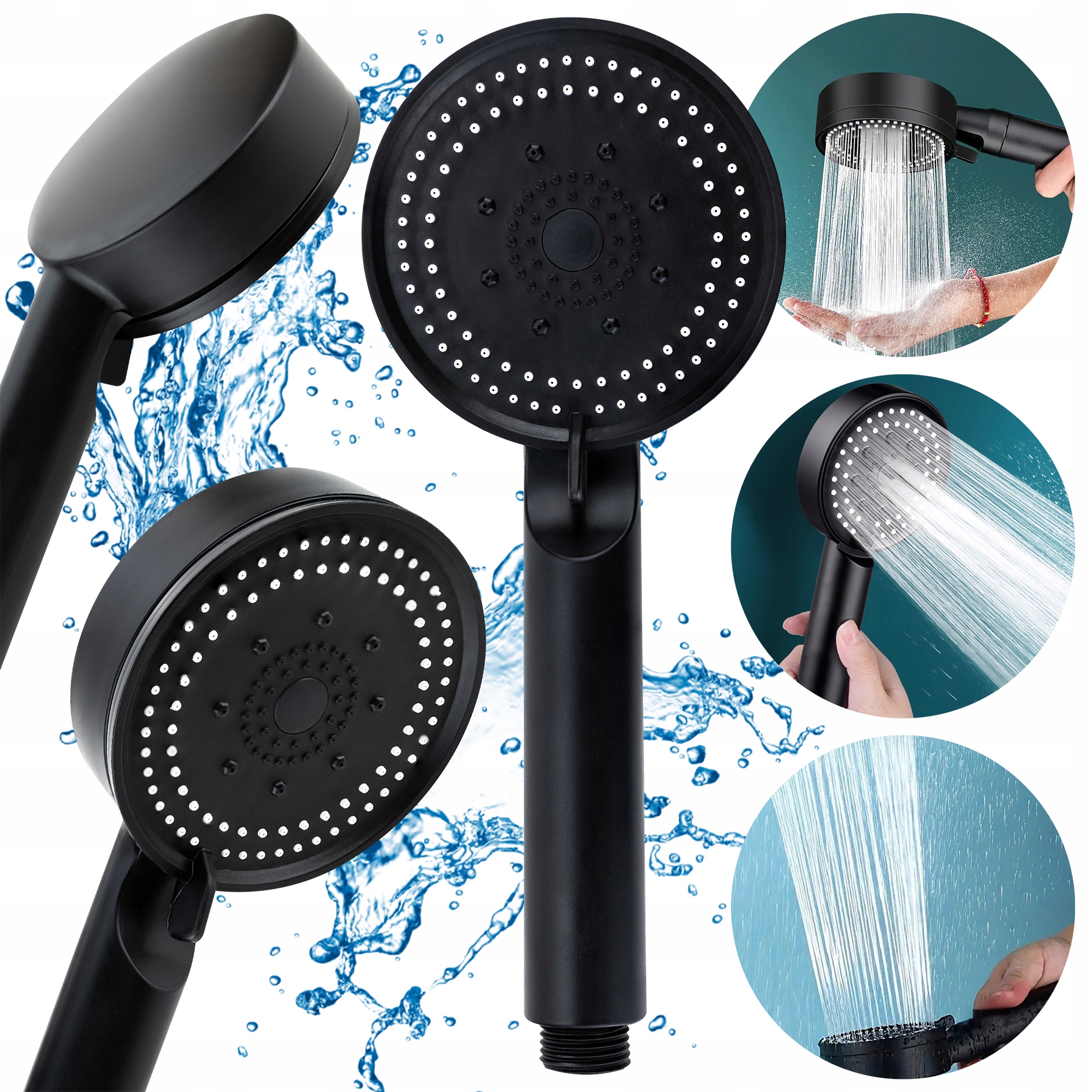Słuchawka prysznicowa z 5 stopniową regulacją strumienia wody, wykonana jest z wysokiej jakości tworzywa sztucznego w kolorze czarnym, który jest odporny na wysoką temperaturę i pęknięcia. Wyposażona w mocne uszczelki, które zapobiegają przeciekaniu wody. Jakość całego produktu sprawia, że kąpiel staje się łatwa oraz przyjemna. Słuchawka posiada gwint, który pasuje do standardowych przewodów prysznicowych. Przeznaczona do podłączenia do natrysku łazienkowego – prysznicowego lub wannowego.