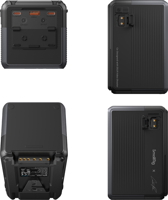 Korpus akumulatora jest wyposażony w interfejsy D-Tap / USB-C / USB-A / DC 8V-OUT / DC12V-OUT / BP, które mogą ładować lub zasilać aparat fotograficzny / kamerę wideo / monitor / bezprzewodowy nadajnik obrazu / lampę wideo LED / telefon komórkowy / laptop itp. bez użycia jakichkolwiek płytek V-mount.