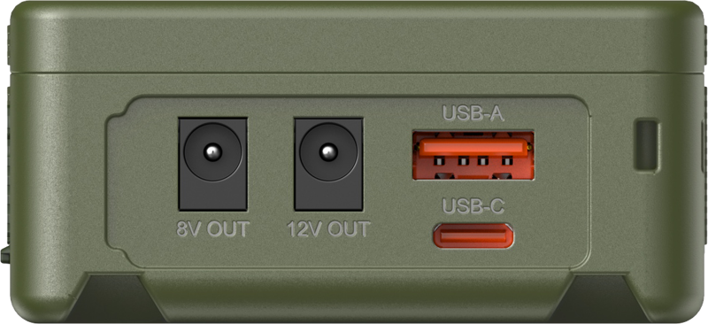 Akumulator wyposażony jest w porty BP, D-Tap, 8V-OUT DC, 12V-OUT DC, USB-C i USB-A, oferując szeroką gamę interfejsów umożliwiających zasilanie wielu urządzeń jednocześnie.