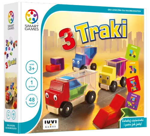 Załaduj ciężarówkę i wyrusz z dostawą! Trzy ciężarówki są w drodze do następnego punktu dostawy. Muszę odebrać ładunek, ale czy ten zmieści się na przyczepie? Czy jesteś w stanie pomóc załadować go w taki sposób, aby wszystko się zmieściło? Młodsze dzieci początkowo wykorzystają ciężarówki do zabawy. Nieco starsze dzieci, mogą grać w „3 Traki” rozwiązując zadania, które stają się coraz trudniejsze. Zawartość opakowania: • 3 drewniane samochody z przezroczystymi naczepami, • 10 kolorowych klocków, • książeczka z zadaniami i ich rozwiązaniami. Za co pokochasz tę grę? • duże i bezpieczne elementy, • idealny prezent dla fanów wszelakich pojazdów, • to nie tylko gra, ale i świetna zabawka z elementem edukacyjnym.