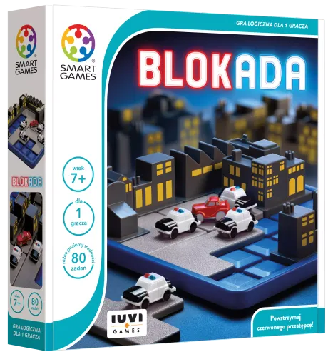 Do wszystkich jednostek! Zatrzymać czerwony samochód! W Blokadzie – policyjnej grze logicznej, dziecko wcieli się w dzielnego szefa policji. Cel jest prosty: kierując policjantami, spróbuj zatrzymać jadącego czerwonym samochodem złodzieja. Nie można pozwolić mu uciec! Na rozwiązanie czeka 80 zróżnicowanych pod względem poziomu trudności zadań. Młodzi dowódcy muszą w nich wykorzystać swoje zdolności planowania i wyobraźni przestrzennej. Do wszystkich jednostek! Czy cel został ujęty? Odbiór! Nauka przez zabawę, to wspólna cecha wszystkich Smartów! Poznaj je już dziś! Za co twoje dziecko pokocha tę grę? • Atrakcyjna dla dzieci tematyka • Zachęcające do gry wykonanie • Trening wyobraźni przestrzennej i koncentracji W skład gry wchodzą: • plansza do gry, • 4 budynki, • 6 elementów układanki z samochodami policyjnymi, • 1 element układanki z czerwonym samochodem złodzieja, • książeczka z 80 zadaniami i ich rozwiązaniami. Wymiary opakowania: 24.0 x 24.0 x 6.0 cm