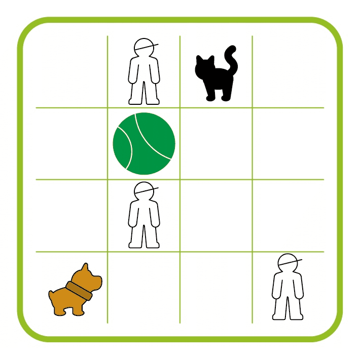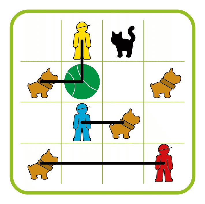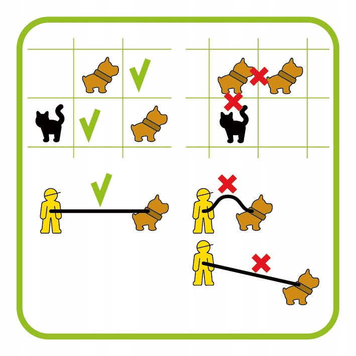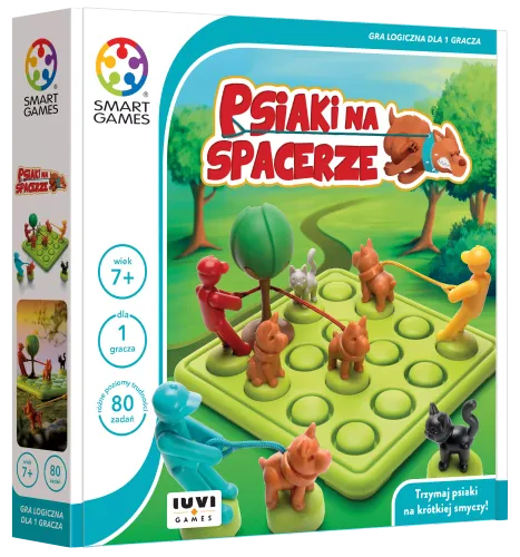 Trzymaj psiaki na krótkiej smyczy! Trzymaj zwierzaki na krótkiej smyczy, tak aby nie pogryzły się z innymi psami i kotami! Wykorzystaj swoje zdolności logiczne i rozmieść psy tak, aby nie wdały się w walkę między sobą... oraz aby nie poplątały się psie smycze. Spróbuj rozwiązać wszystkie 80 zadań, od prostych do bardziej skomplikowanych, ale pamiętaj – to nie będzie zwykły spacerek. Zawartość opakowania: • plansza do gry, • 3 figurki ludzi z psami na smyczy, • 1 figurka siedzącego psa, • 2 figurki kotów, • 1 figurka drzewa, • książeczka z 80 zadaniami i ich rozwiązaniami, • bawełniany worek ułatwiający transport gry. Za co pokochasz tę grę? • Kochasz gry w których psy są głównym tematem? Psiaki na spacerze z pewnością Ci się spodobają! • Niech jednak nie zwiodą Cię te urocze figurki w tej grze jest pełno kombinowania! • Przystępna forma pozwala dzieciom zaangażować się w naukę logicznego myślenia.
