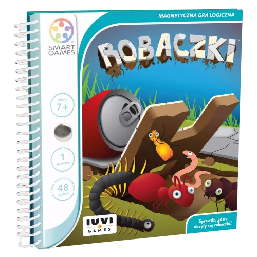 Odszukaj sekretne kryjówki robaczków! Robaczki to magnetyczna gra logiczna, oparta na znanej i lubianej zabawie „w chowanego”. Posługując się wskazówkami, wspólnie rozwiążecie 48 całkiem nowych zadań. Pomóż nieśmiałym owadom skryć się pod kamieniami, i pozostaw odkryte tylko te, które są wymienione w zagadce. To takie proste! Podobnie jak w poprzednich odsłonach, tak i tym razem atrakcyjne wykonanie sprawi, że dziecko będzie naturalnie zachęcane do zabawy. Zawartość opakowania: • magnetyczna książeczka, • plansza z 48 zadaniami i ich rozwiązaniami, • 5 magnetycznych płytek. Za co pokochasz tę grę? • Tytuł idealny dla fanów wszelkiego rodzaju robaczków! • Mały format gry, dzięki czemu można grać w nią wszędzie – nawet w podróży! • Ciekawa alternatywa dla zabawy hide & seek.