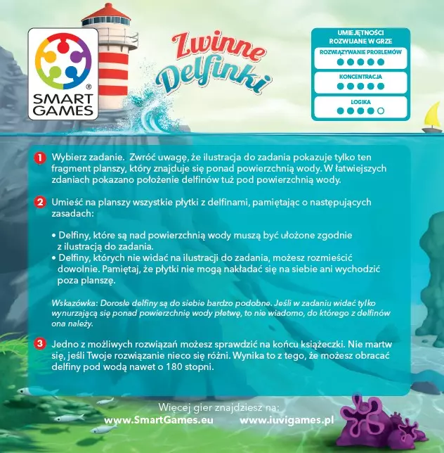 Odkryj podwodne tajemnice! Delfiny kochają figle, zabawy i akrobacje... Jaka szkoda, ze możemy je podziwiać tylko wtedy, gdy wyskakują ponad taflę wody! A może zdołasz odgadnąć, co robią delfiny, gdy są pod woda? Zanurz się w świat „Zwinnych delfinków” – gry, w której zmierzysz się z 48 zadaniami o rosnącym poziomie trudności. Dzięki magnetycznym elementom, w grę można zagrać w dowolnym miejscu, a nawet w czasie podróży! Nauka przez zabawę to wspólna cecha wszystkich Smartów! Poznaj je już dziś! Za co pokochacie tę grę? • przyjazna tematyka, • doskonała do podróży, • trening wyobraźni i koncentracji. W skład gry wchodzą: • magnetyczna książeczka-plansza z 48 zadaniami ich rozwiązaniami, • 7 magnetycznych płytek z delfinami. Wymiary opakowania: 16.2 x 15.8 x 1.5 cm