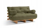 Na zestaw składa się Futon Pascall Slim Latex w kolorze Khaki o wymiarach 140x200 cm, o grubości 14 cm oraz drewniana, sosnowa ławka będąca podstawą sofy.