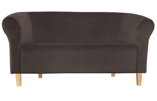 Miękka sofa wypoczynkowa wykonana z tkaniny typu Velvet, wyposażona w drewniane nóżki w kolorze buk.