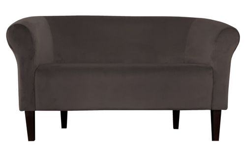 Miękka sofa wypoczynkowa wykonana z tkaniny typu Velvet, wyposażona w drewniane nogi w kolorze venge tj. bardzo ciemnego brązu.