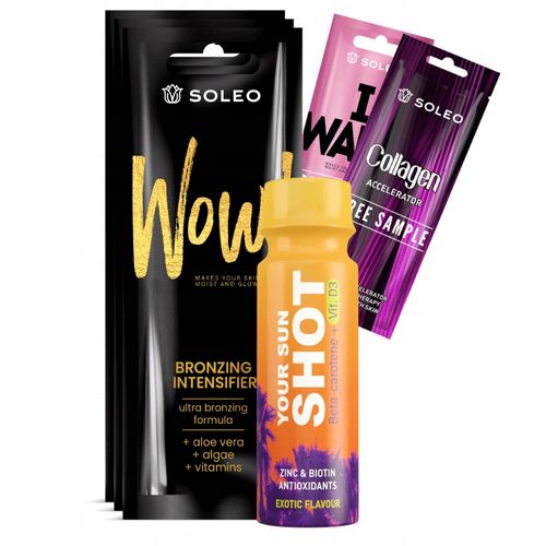 Odkryj tajemnicę idealnej opalenizny z zestawem Soleo Wow! 3x15ml Ultra Bronzer do opalania! Ten wyjątkowy zestaw składający się z mocnego bronzera, napoju Your Sun Shot oraz próbek Soleo to prawdziwa gratka dla miłośników złocistej opalenizny, które pragną uwydatnić blask swojej skóry przez cały rok.