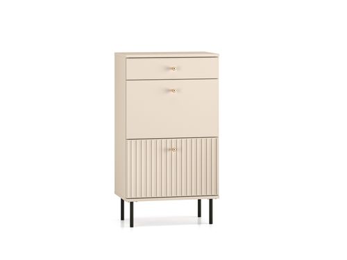 SOPHIE to kolekcja mebli która łączy nowoczesność i funkcjonalność. Ryflowania zdobiące fronty mebli stanowią piękną dekorację. Złote uchwyty oraz czarne metalowe nóżki podkreślają charakter mebli.