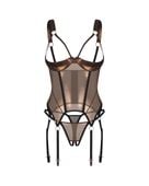 Połyskujący gorset i otwarte stringi Soranna od Obsessive to uosobienie zmysłowej elegancji i kobiecej siły. Transparentna siateczka z delikatnym, złotym połyskiem otula ciało, podkreślając jego kształty i dodając blasku. Fiszbiny pod biustem zapewniają efektowne uniesienie, a pionowe przeszycia wysmuklają sylwetkę, tworząc perfekcyjny efekt wizualny.