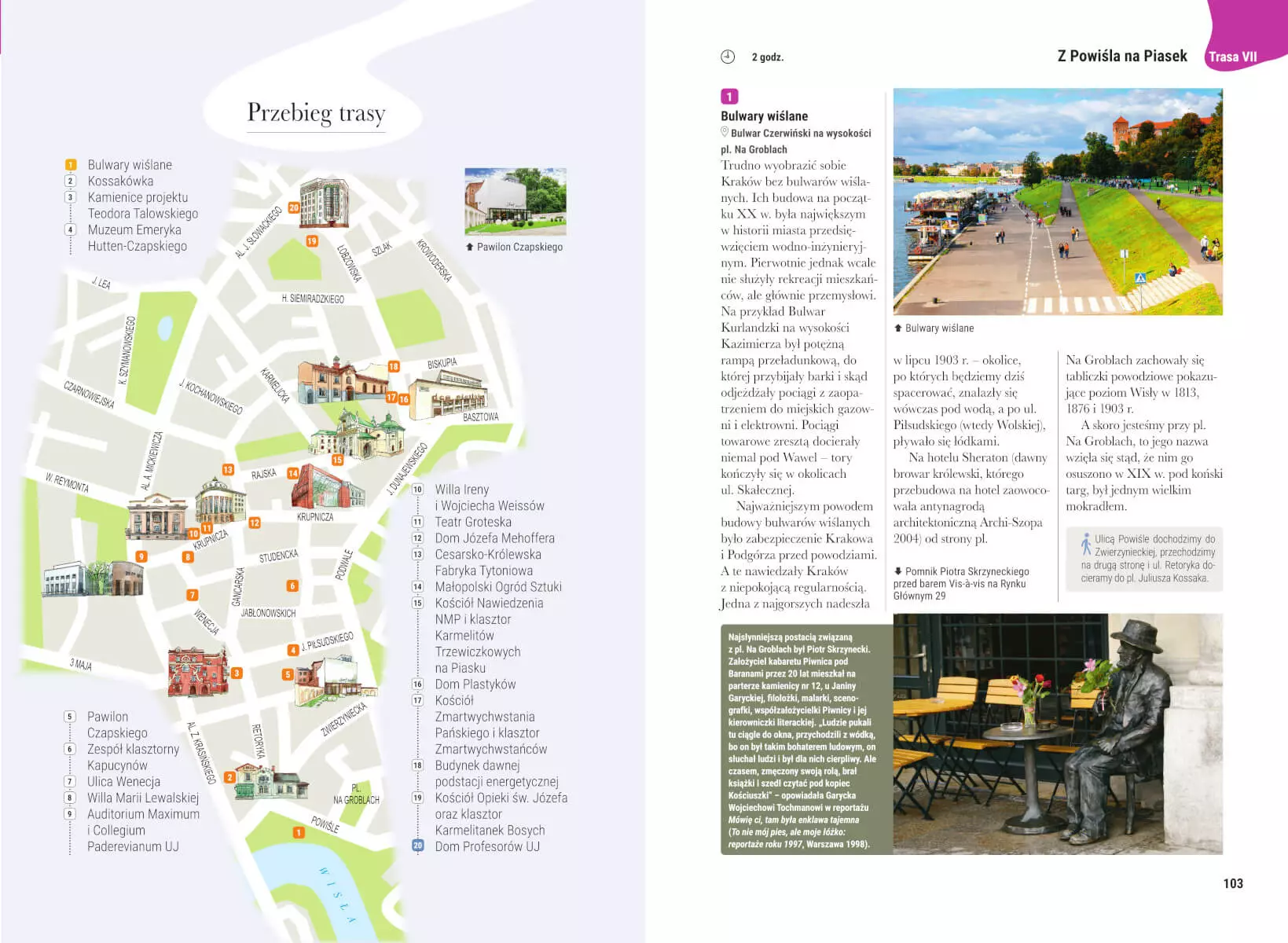 Spacerownik zawiera 14 tras obejmujących atrakcje Krakowa – te najbardziej znane i te mniej oczywiste. Autorka, która zna tu każdy kąt, kreśli portret miasta z pasją i w zajmujący sposób, prezentując jego wyjątkowość i wszystko, z czego słynie. Opowiada o zabytkach i związanych z nimi ludziach, o artystach, którzy tworzyli (i tworzą) kulturalny pejzaż Krakowa, o miejscach modnych i gwarnych oraz tych nieco zapomnianych, a z pewnością zasługujących na odkrycie. Podpowiada, gdzie warto zatrzymać się na dłużej i po prostu poleniuchować – odetchnąć wśród zieleni, podelektować się kawą i widokiem, poszperać wśród książek w maleńkiej księgarni, pobuszować w galerii z rękodziełem. Rekomenduje sympatyczne knajpki, kawiarnie, minigalerie, prowadzi także do atrakcji, które większość przewodników pomija – zaprasza do odkrywania urokliwych zakątków, murali, rzeźb, czarujących zaułków i enklaw zieleni. Wszystko to pozwala poczuć wyjątkową atmosferę Krakowa.