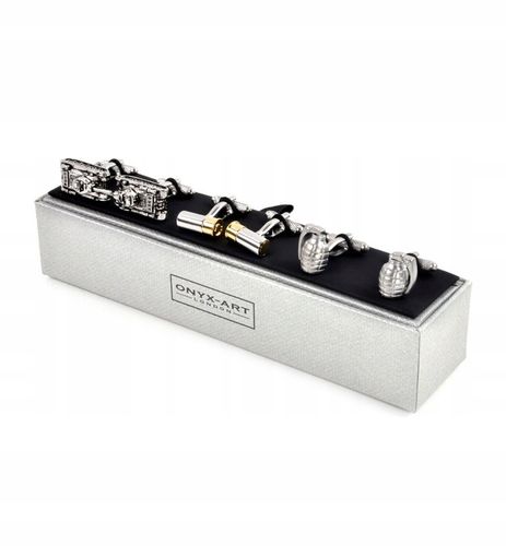 Ten ekskluzywny zestaw spinek do mankietów Onyx Art London o tematyce militarnej wyróżnia się precyzyjnym wzornictwem inspirowanym wojskową elegancją, obejmującym motywy czołgu, łuski i granatu. Zapakowany w stylowe szaro-srebrne pudełko z logo marki, zapewnia nie tylko praktyczność, ale także poczucie prestiżu w każdym detalu, idealnie podkreślając profesjonalny wizerunek.