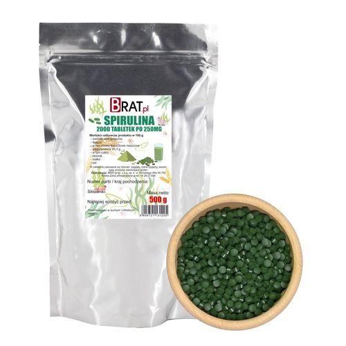 Opakowanie zawiera 500g spiruliny w tabletkach (około 2000 tabletek po 250mg sprasowanej algi).